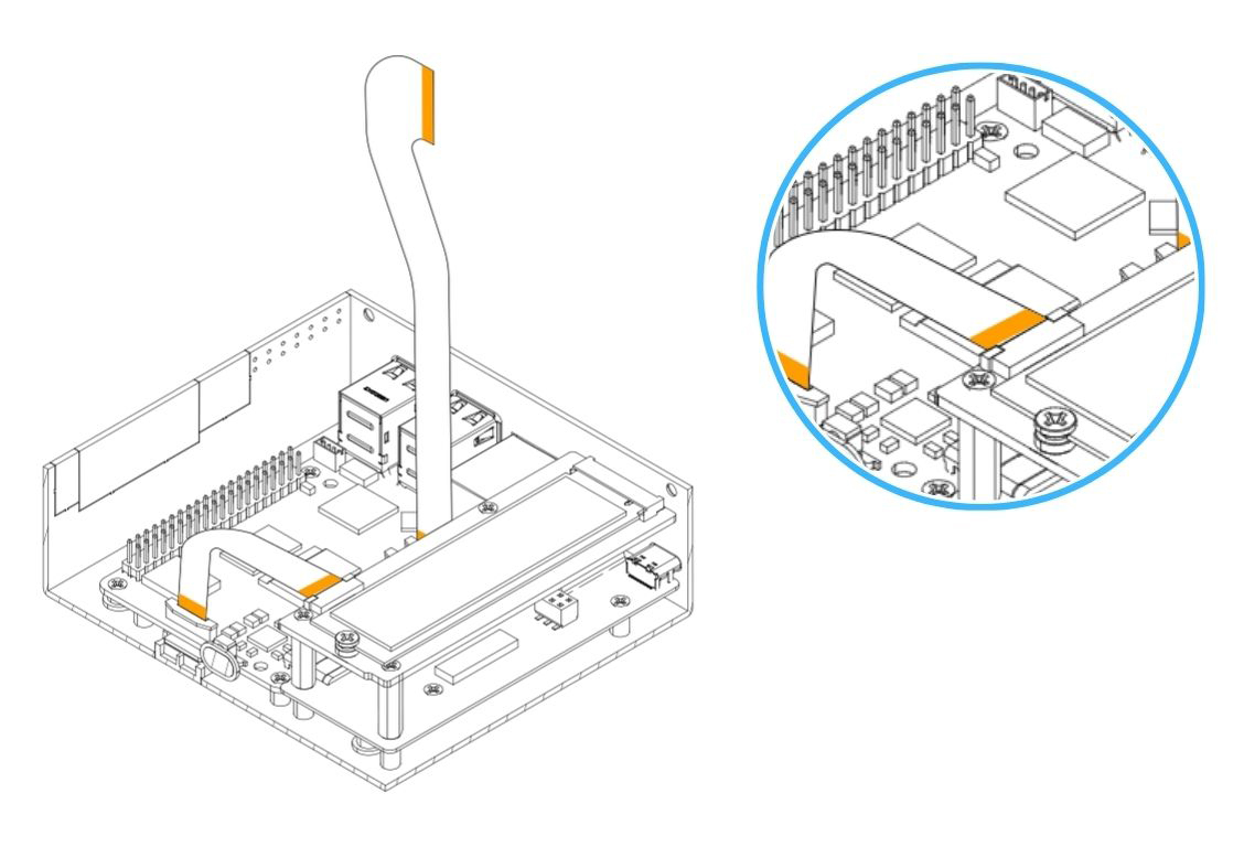 8. Carefully connect the PCIe Flat Flex Cable to the Argon NVMe Board. Be careful when handling the NVMe board connector flip/cover. Pull the flip to release the lock.