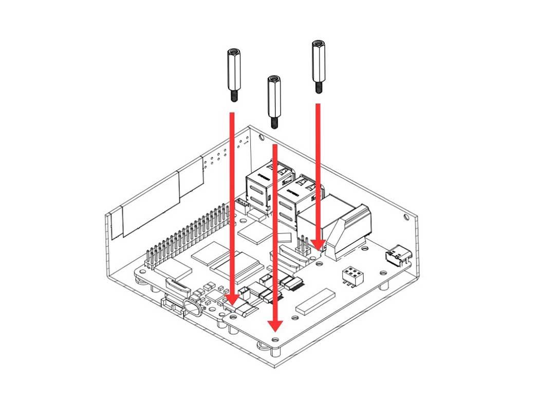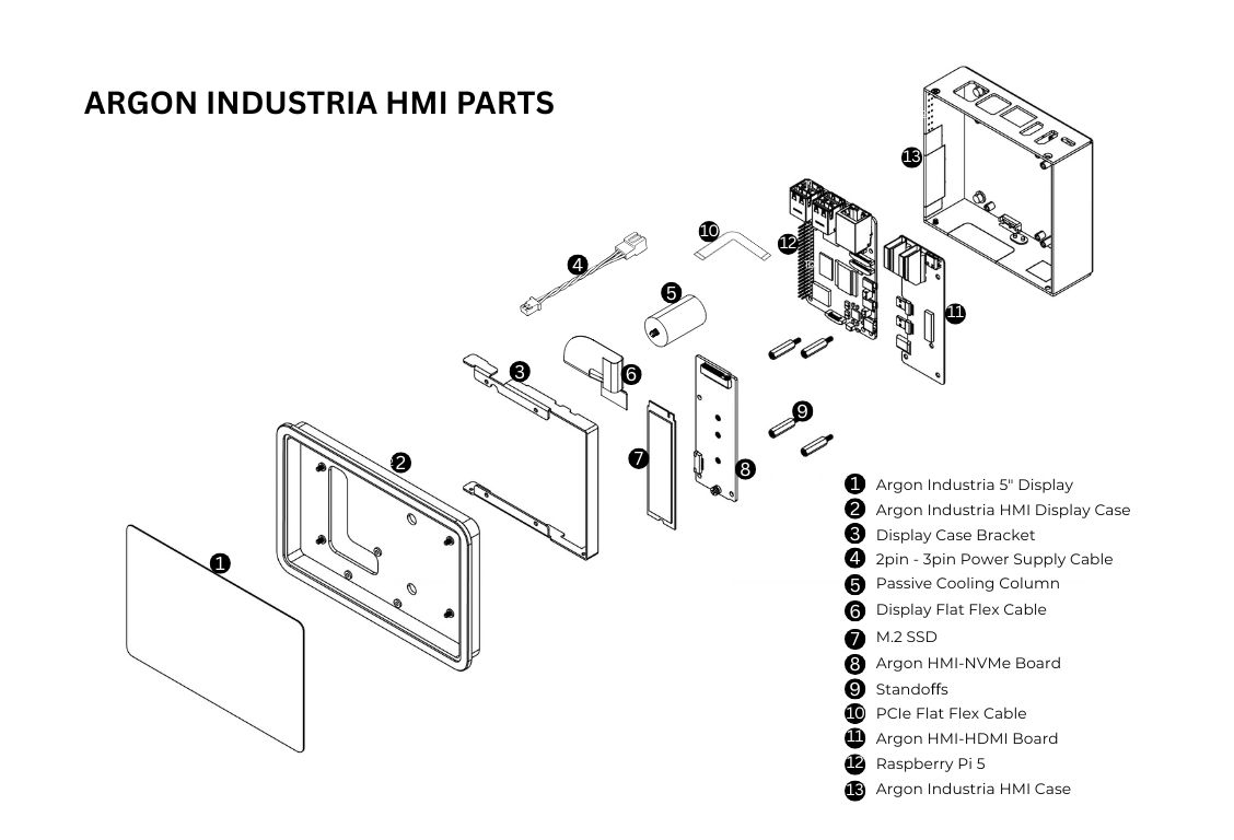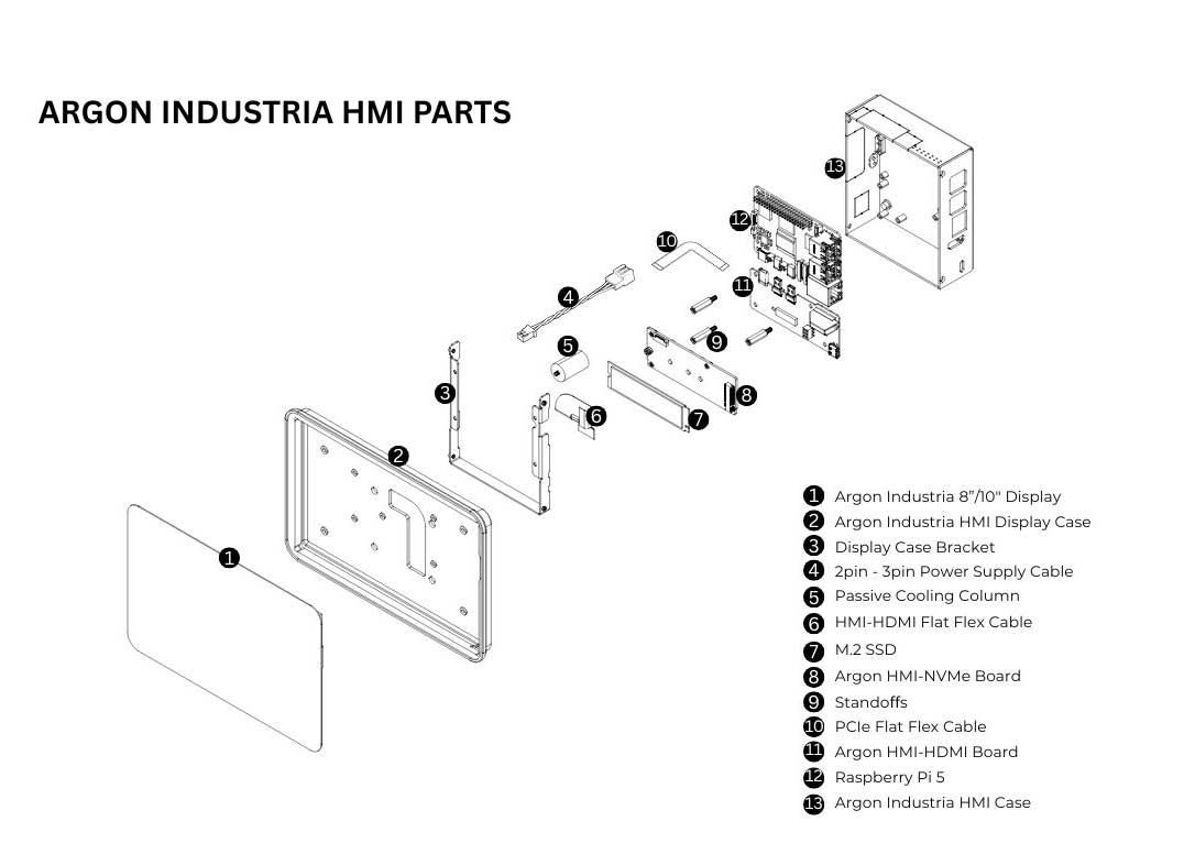 4. Carefully attach the Raspberry Pi 5 and the Argon HMI-HDMI Board into the Argon Industria HMI Case. Secure the boards using the flat head screws. Also secure the Argon HMI-HDMI Board using the Standoffs.