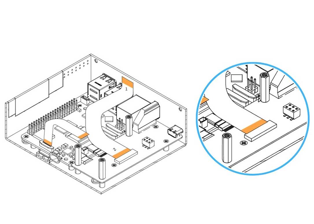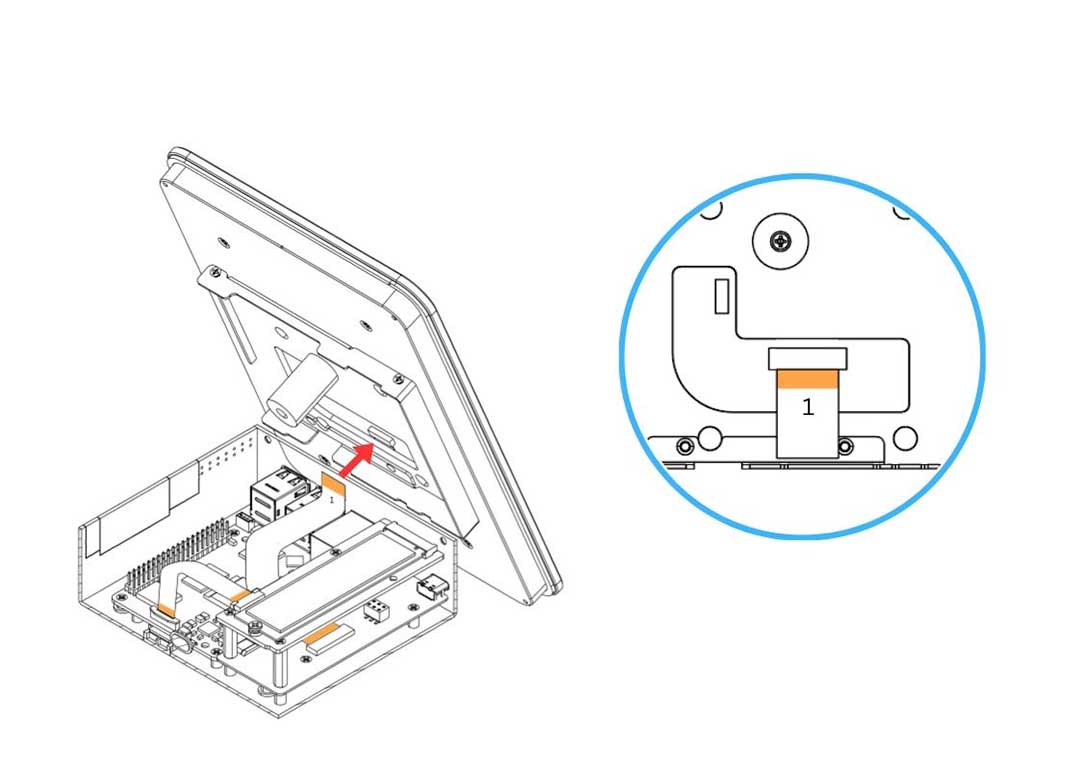 11. Carefully connect the HMI-HDMI Flat Flex Cable to the Argon Touch Display. Be careful when handling the Display flip/cover. Pull the flip to release the lock. COPPER SIDE of the strip should be facing the white side of the Argon Touch Display connector. Make sure yo connect the no.1 side.