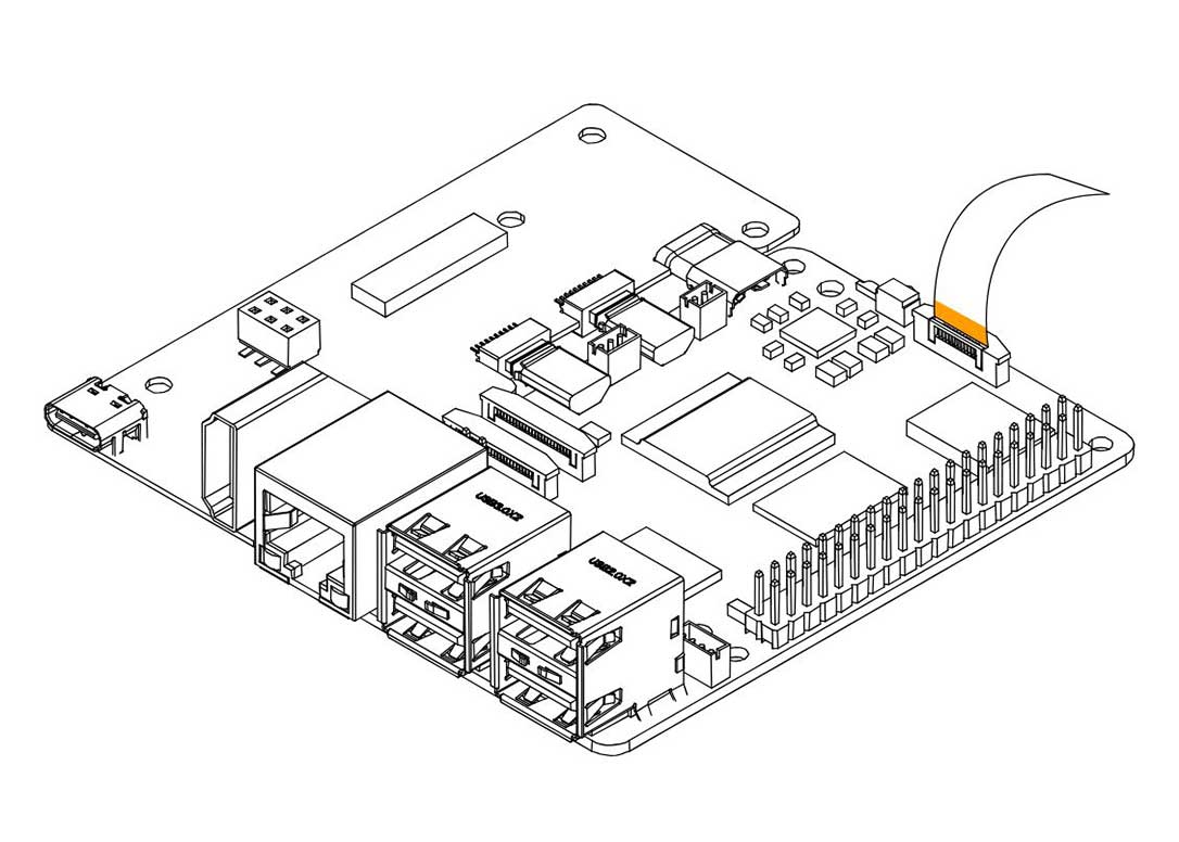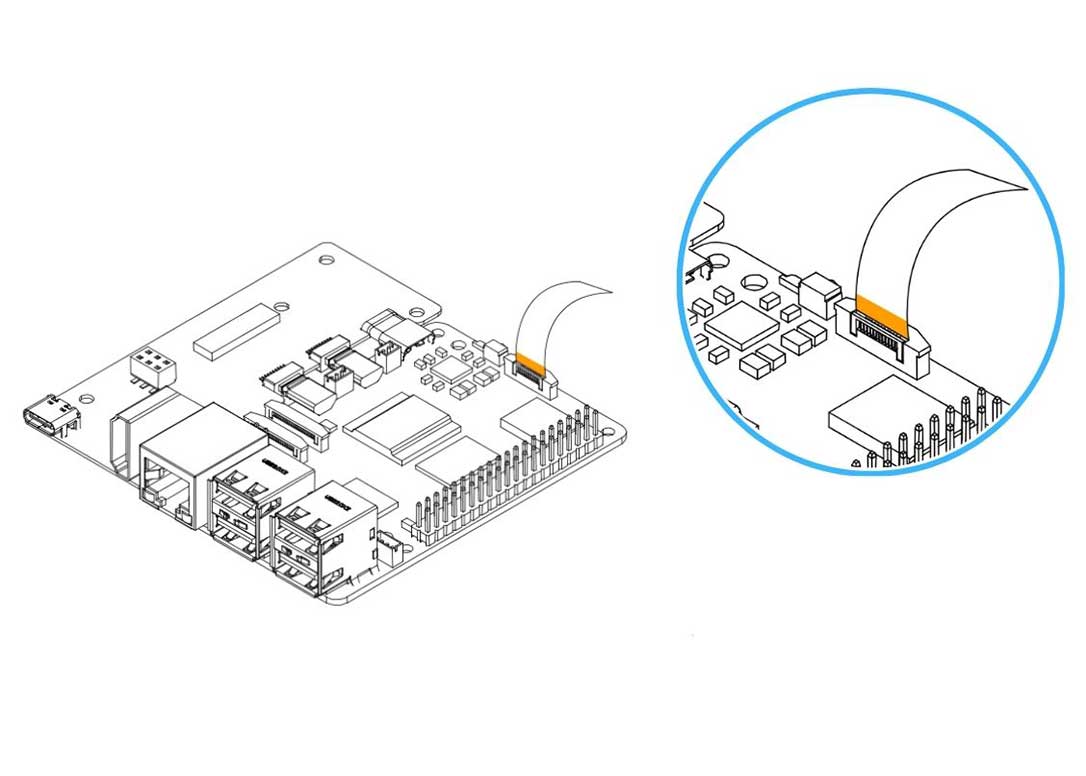 3. Carefully connect the PCIe Flat Flex Cable to the Raspberry Pi 5 PCIe Connector. Be careful when handling the brown PCIe flip/cover. Pull up the brown flip to release the lock. COPPER SIDE of the strip should be facing the white back side of the PCIe connector of the Raspberry Pi 5.